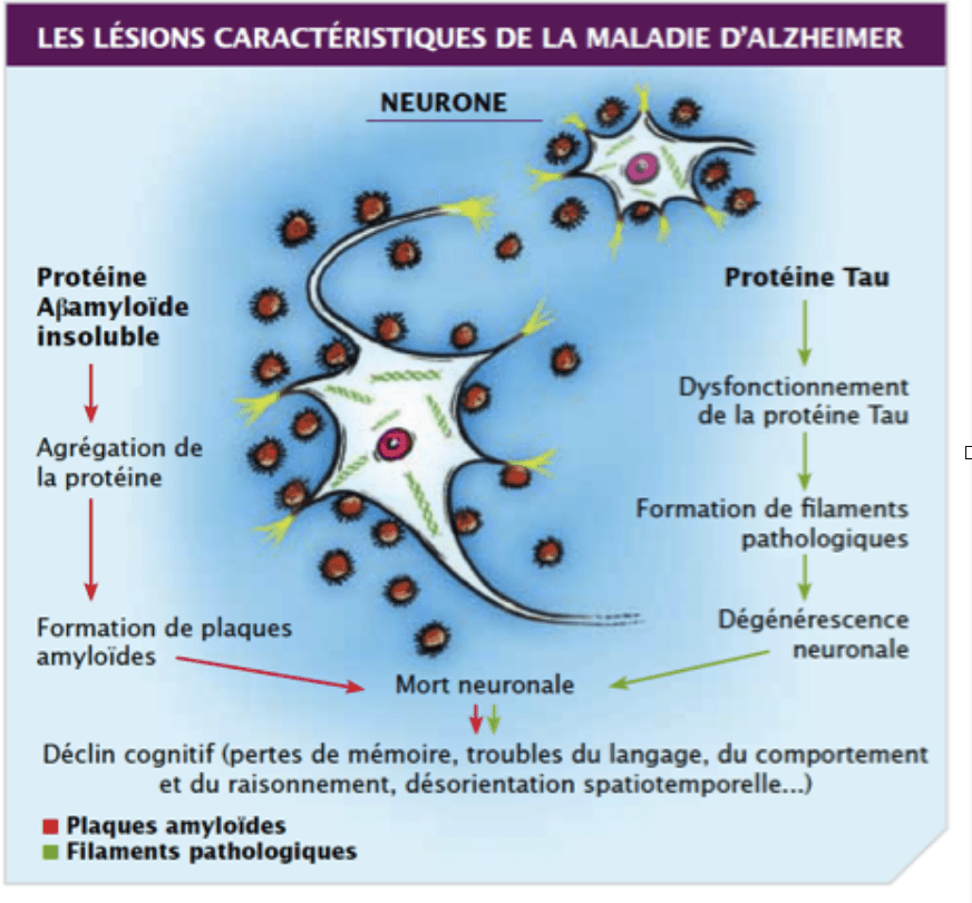 *Dégénérescences neurofibrillaires : accumulation à l’intérieur des neurones de filaments pathologiques, constitué s d’une protéine appelée Tau et conduisant à la mort progressive des neurones. (France Alzheimer)
